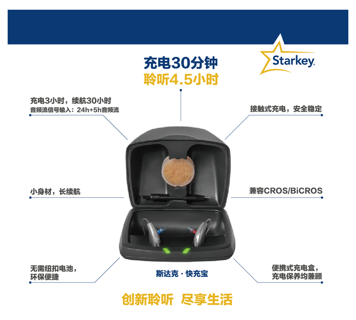 充電3小時,續(xù)航30小時;接觸式充電,安全穩(wěn)定;小身材,長續(xù)航;兼容CROS/BiCROS;無需紐扣電池,環(huán)保便捷;便攜式充電盒,充電保養(yǎng)均兼顧